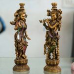 This set of two brass statues depicts a man playing a flute and a woman holding a lotus flower. The statues are likely inspired by Hindu deities, possibly Krishna and Radha, although they lack some of the defining attributes, such as the peacock feather crown Krishna is typically depicted wearing. The statues are made of brass and have a polished finish.