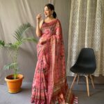 Women’s Artistic Terracotta Orange Linen Saree with Kalamkari Inspired Print & Tassel Detailing – Perfect for Casual Festivities & Cultural Events
