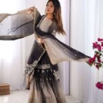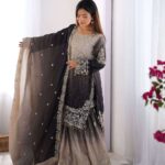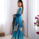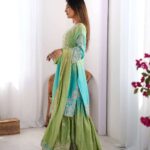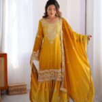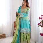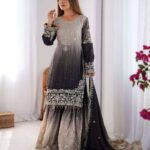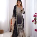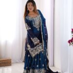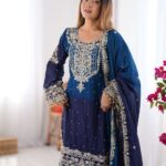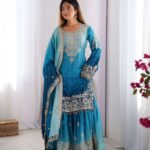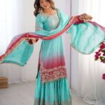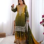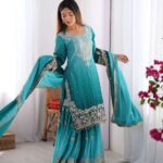 Women’s Chinon Silk Sequence With Rivet Moti Work Straight Kurta With Sharara and Dupatta Set