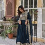 Presenting an elegant Faux Blooming gown, exquisitely adorned with embroidery, zari, and sequins work. This comfortable ensemble features a full cotton lining, full sleeves, a round neck, and a magnificent 3.5 MTR flair. It comes with a matching Faux Blooming dupatta featuring sequins work and a designer lace border. Available in sizes M-XXL and two colors, priced at the best rate of ₹4,100.00.
