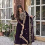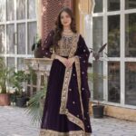 Women’s Luxurious Plum Velvet Anarkali Gown with Heavy Gold Zari & Sequin Embroidery – Perfect for Weddings & Grand Festivities